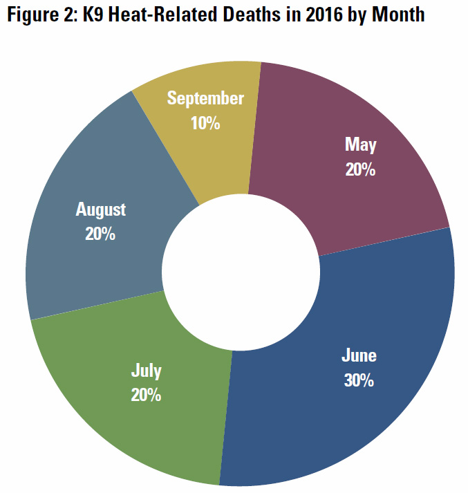 Previous ImageNext Image Figure 2 K9 Heat-Related Deaths in 2016 by Month A pie chart indicates the relative percentages of K9 heat-related deaths during the summer months