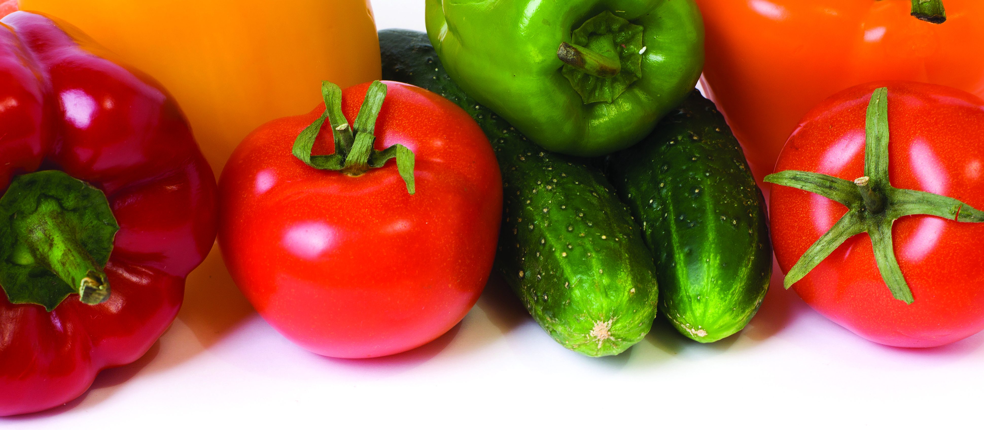 Previous ImageNext Image Red yellow and orange peppers with tomatoes on a white background. Cucumbers with colorful peppers in composition on a white background