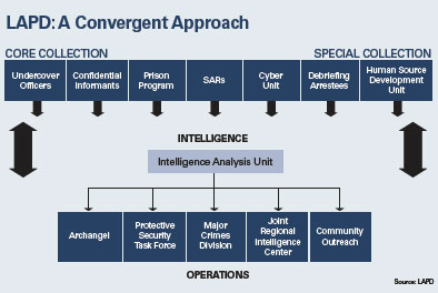 Figure 2. The graphic depicts a convergent approach to information/intelligence collection that feeds into operational decision making, both in terms of critical operational decision making and deployment or tactical resource allocation. The double-sided arrows illustrate the fact that in this system, intelligence can feed operations or operations can feed intelligence collection requirements.