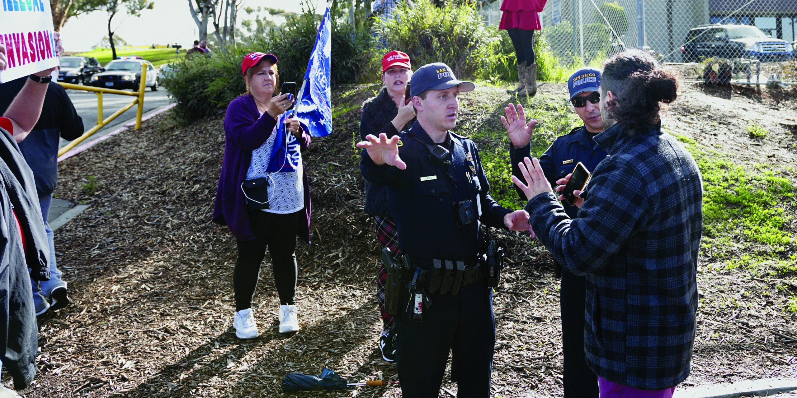 SAN YSIDRO, CA – JANUARY 12: Chula Vista Police keep a pro-migrant demonstrator away from Pro-wall demonstrators in front of a Border Patrol station on January 12, 2019 in San Ysidro, California. The Government shutdown continues as the fight for border wall funding drags on.(Photo by Sandy Huffaker/Getty Images)