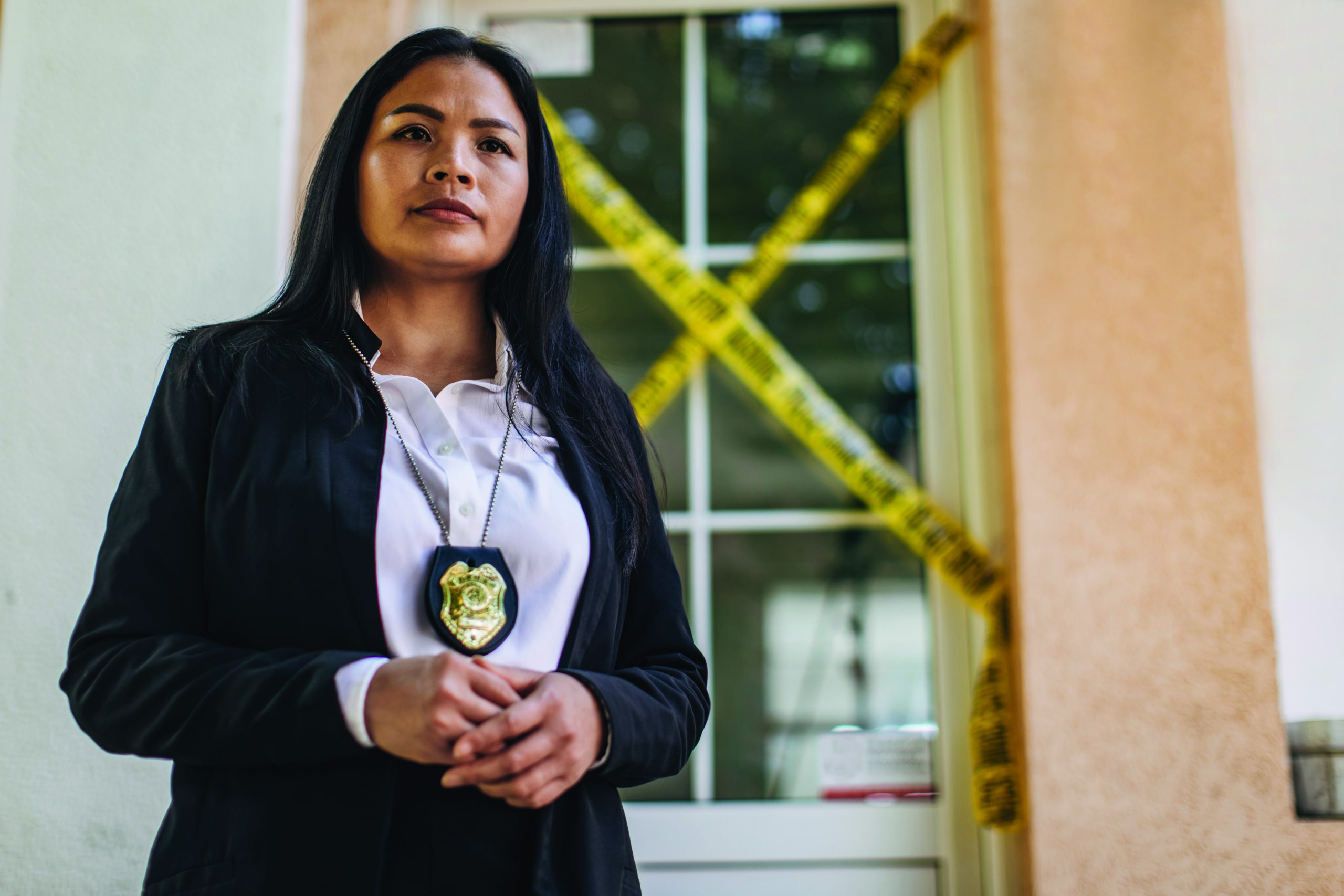 Previous ImageNext Image Police chief at the crime scene One woman, female police chief standing outdoors in front of house where crime happened.