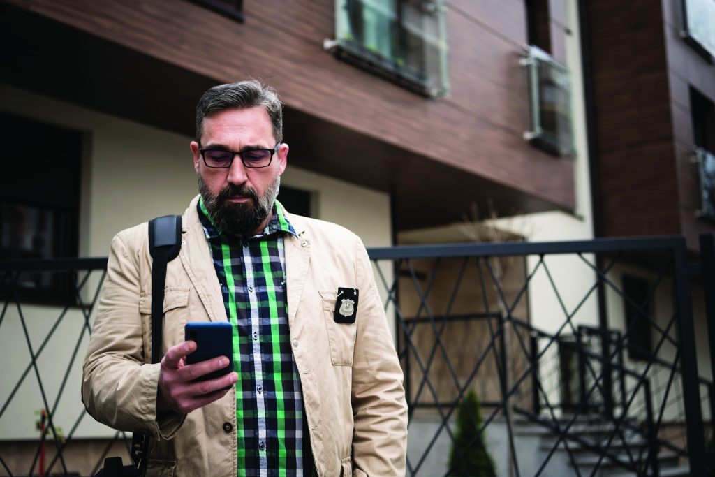 Next Image The detective collects important information from a mobile phone Mature Man detective receiving information on headphone
