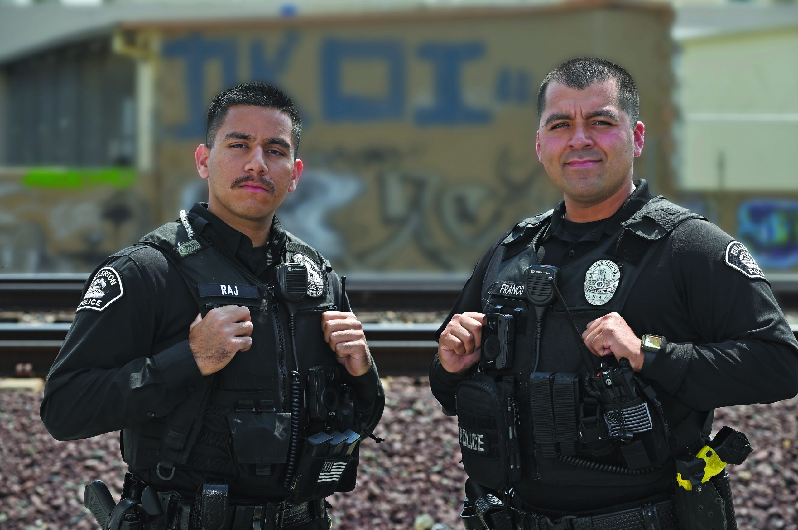 Fullerton PD Homeless Liaison Officers Max Raj, left, and Bryan Franco out in the field as they contact homeless people.
