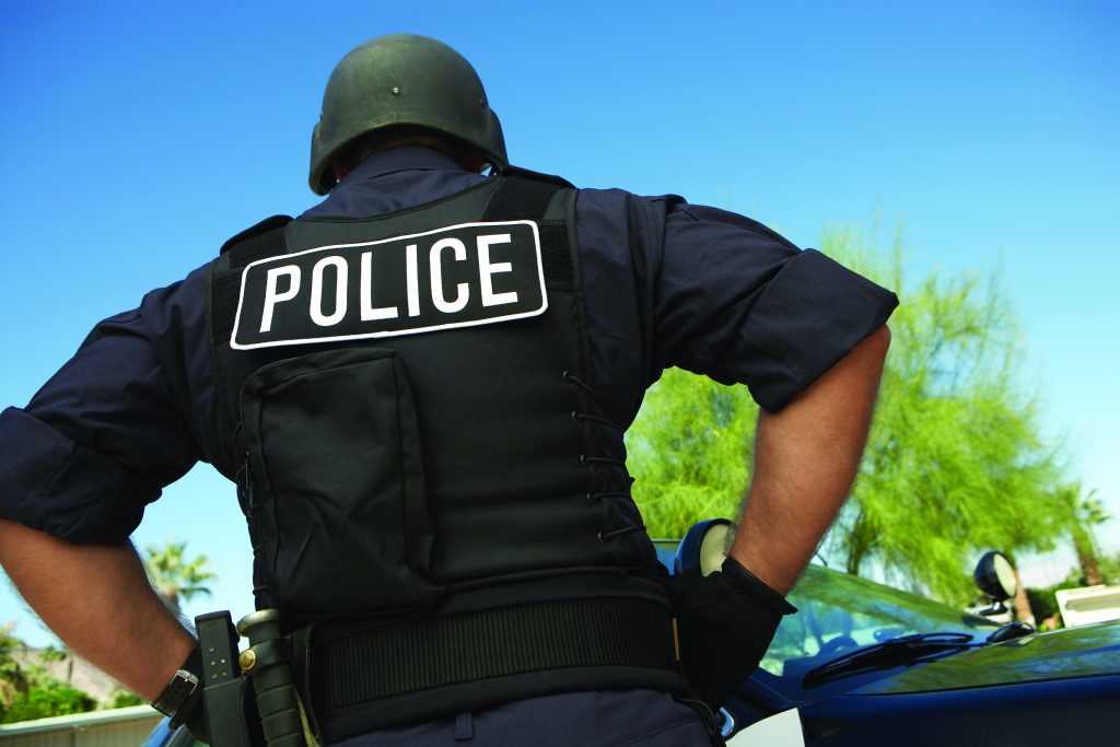 Next Image Policeman In Uniform Standing Against Car Rear view of policeman in uniform standing against car