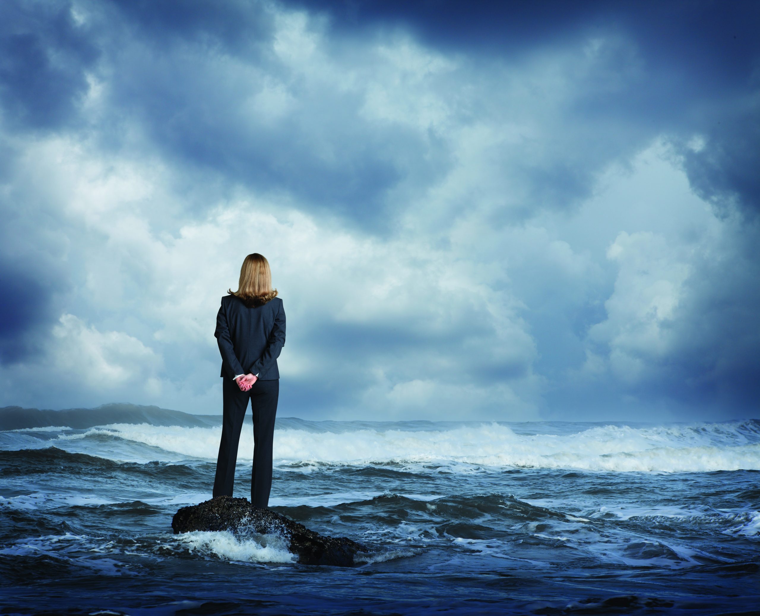 Previous Image Businesswoman Standing In Rough Ocean Surf A rear view of a businesswoman as she stands on a small rock in a rough ocean surf. She stands with her hands clasped behind her back as she looks out across the rough waters and out towards the stormy sea.