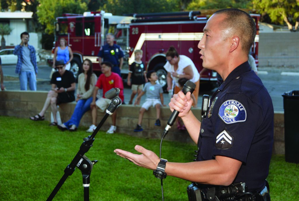 Glendale, CA, USA – August 5, 2014: A police officer stands at a microphone discussing neighborhood crime prevention with a small group of community members at a National Night Out against crime neighborhood fair held August 5, 2014 in Glendale, California.