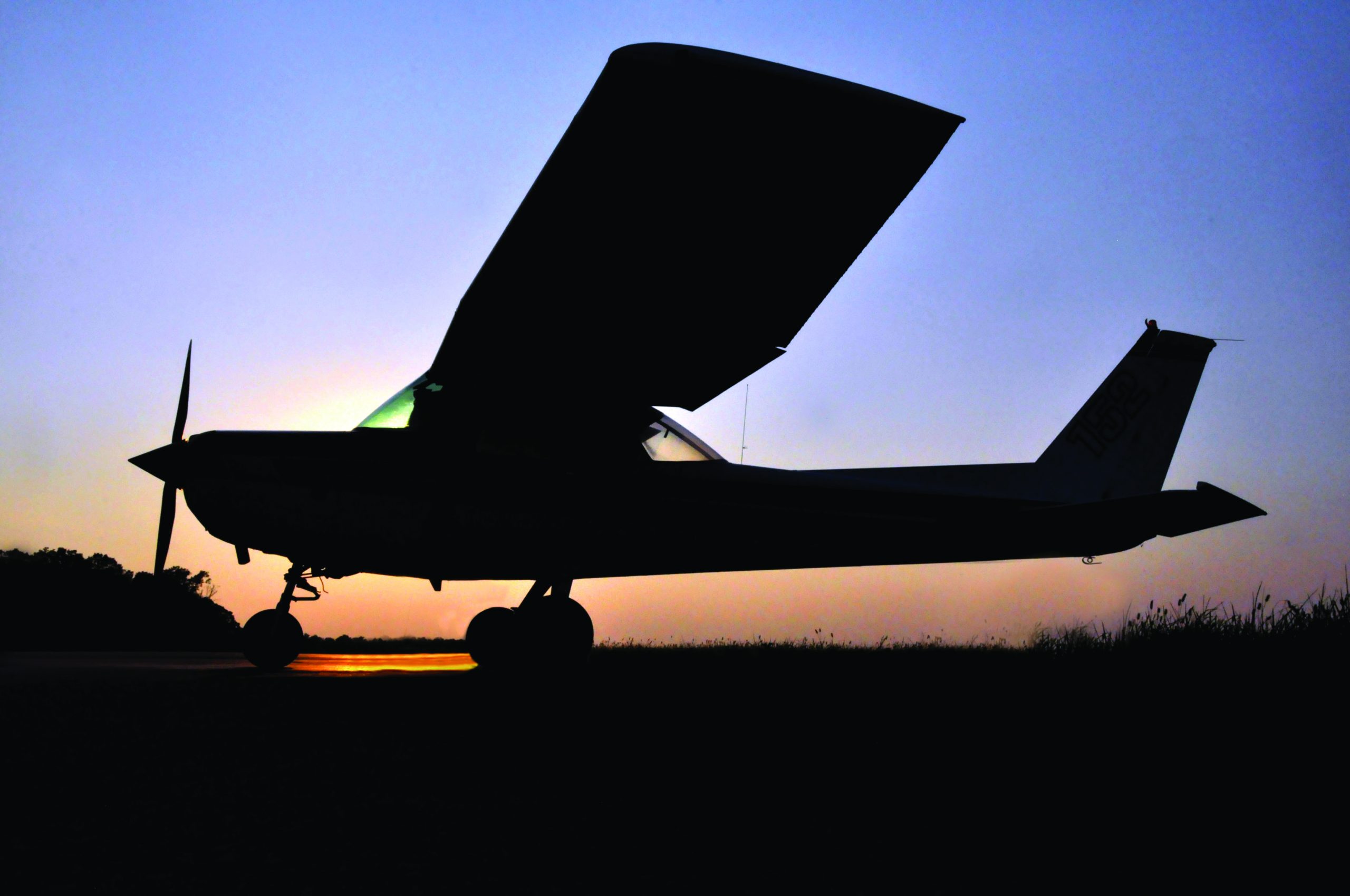 Next Image Silhouettes Silhouette of a Cessna 182 airplane seen at sunset at Princeton Airport, Princeton, New Jersey United States