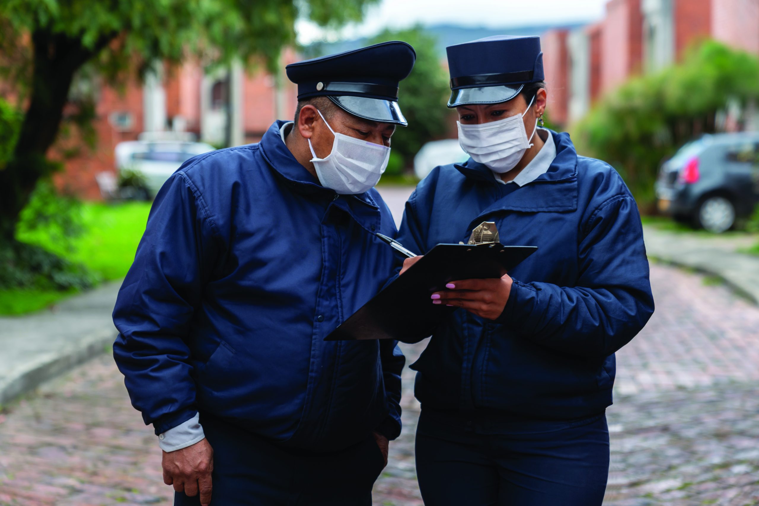 Team of security guards working together wearing facemasks while keeping a logbook on a clipboard