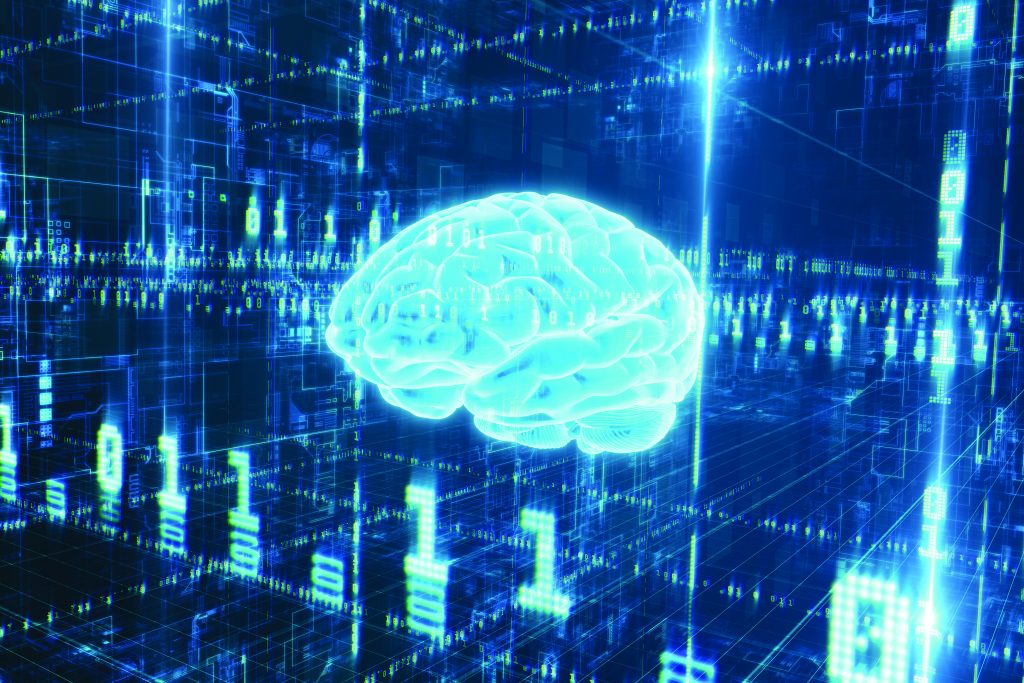 Next Image Artificial intelligence brain and binary number Artificial intelligence brain with binary number on a huge digital space.