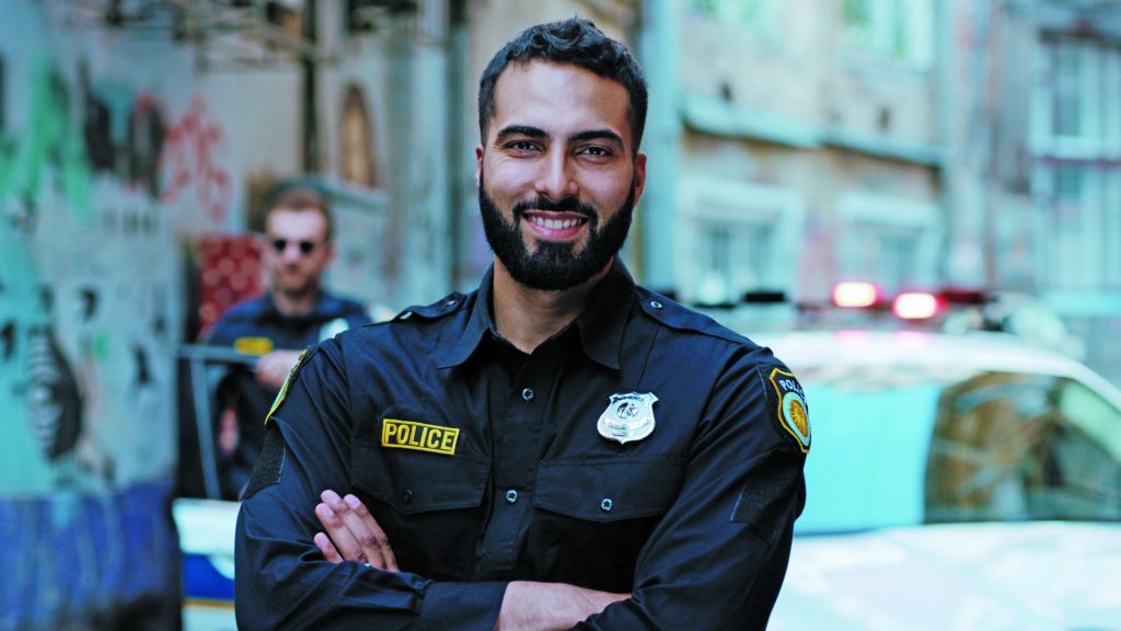 Previous ImageNext Image Smiling,Young,Man,Cops,Stand,Near,Patrol,Car,Look,At Smiling young man cops stand near patrol car look at camera enforcement happy officer police uniform auto safety security communication control policeman portrait close up slow motion