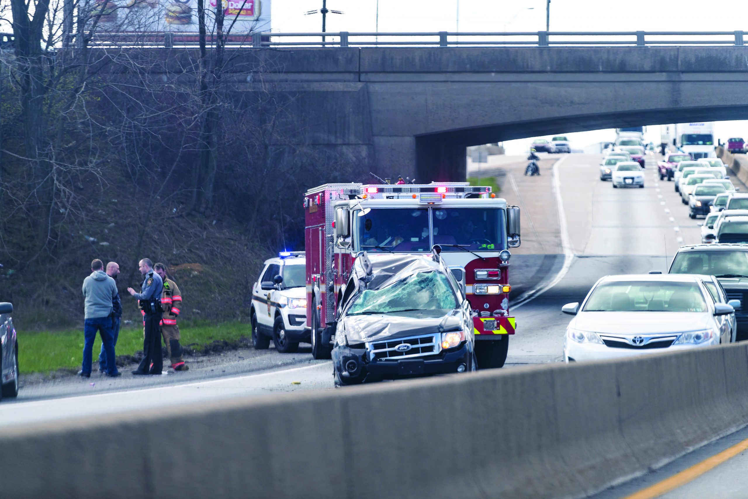 Car accident, vehicle crash, wreck on interstate highway 83 with fire engine truck sheriff policeman in Pennsylvania Photo by Spencer Platt/Getty Images.