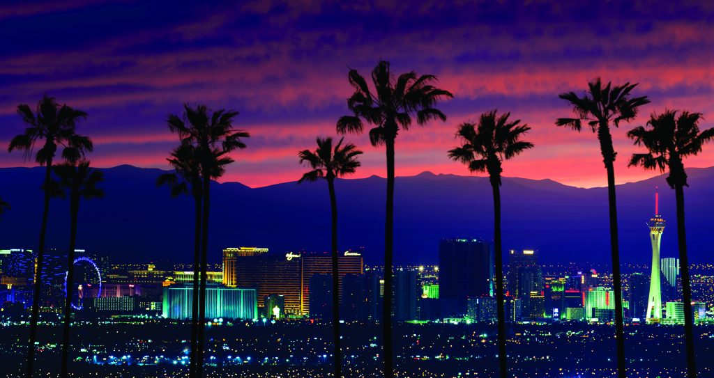 Next Image Las Vegas A stock photo of Las Vegas, Nevada with Palm trees in the foreground. Shot at Sunset.