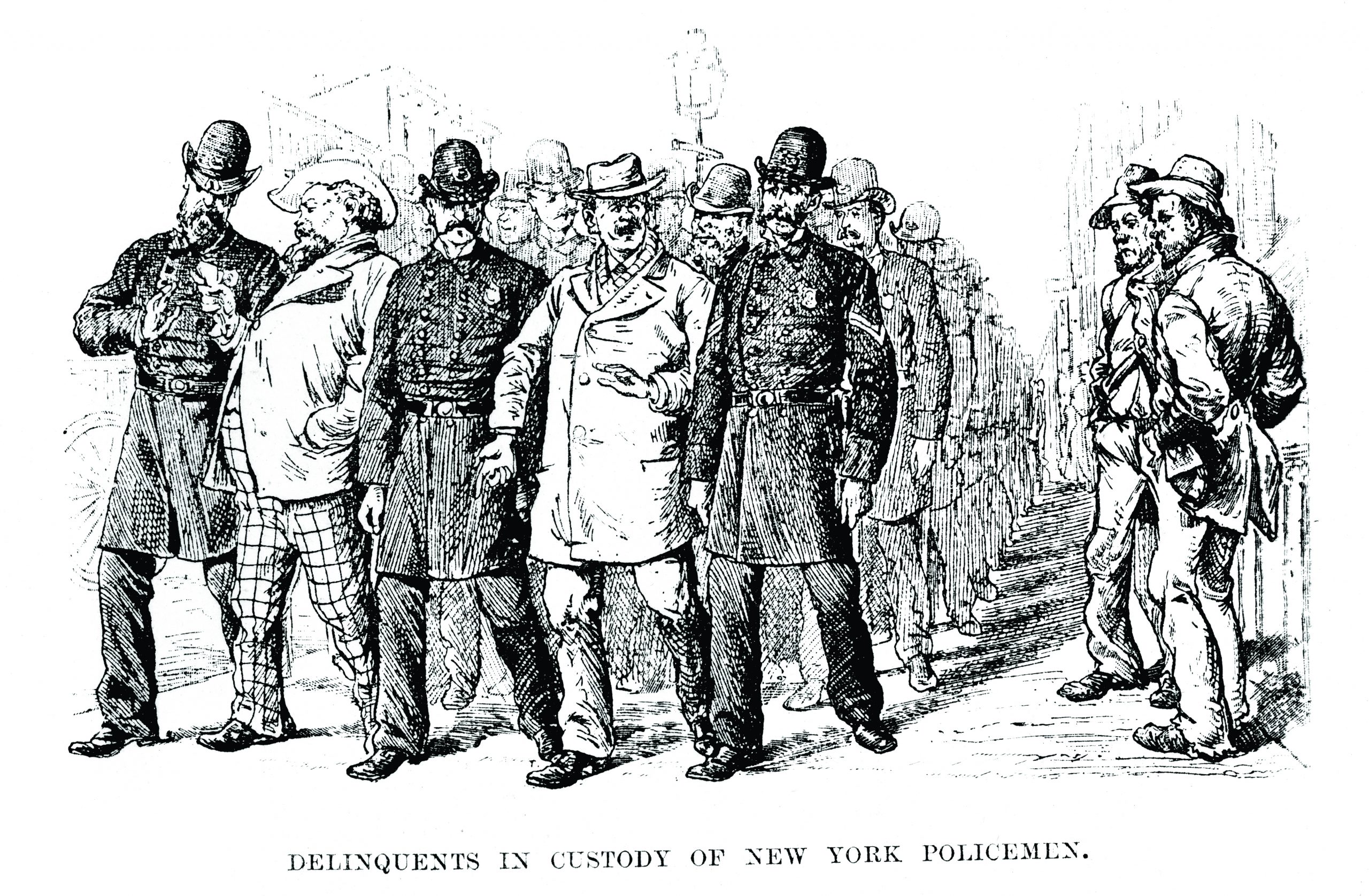 Previous ImageNext Image Delinquents in Custody, New York Vintage engraving of Delinquents in Custody of New York Policemen, New York, 1882