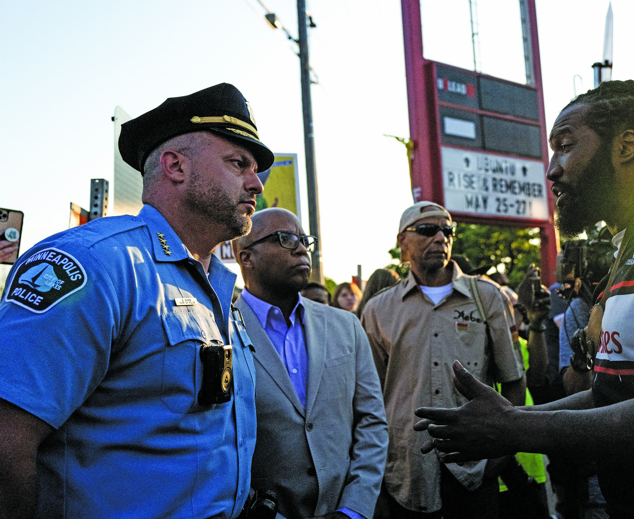 MINNEAPOLIS, MINNESOTA – MAY 25: Michael Wilson (R) speaks with Minneapolis Police Chief Brian O’Hara (L) and former Chief Medaria Arradondo (C) as they arrive for a vigil at George Floyd Square on May 25, 2023 in Minneapolis, Minnesota. Today marks three years since Floyd was killed in 2020 by a Minneapolis police officer who was found guilty of second-degree murder. (Photo by Stephen Maturen/Getty Images)