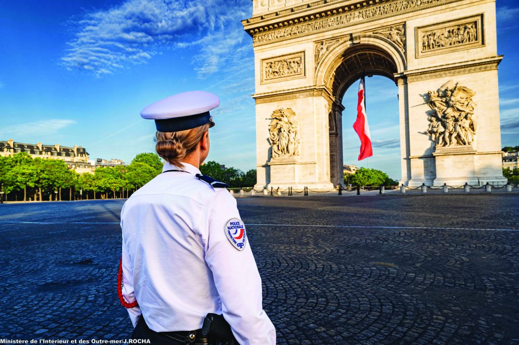 Policière de la préfecture de police de Paris, devant l’arc de triomphe, lors de la mise en place du jalonnement pour la sécurisation du défilé du 14 juillet.