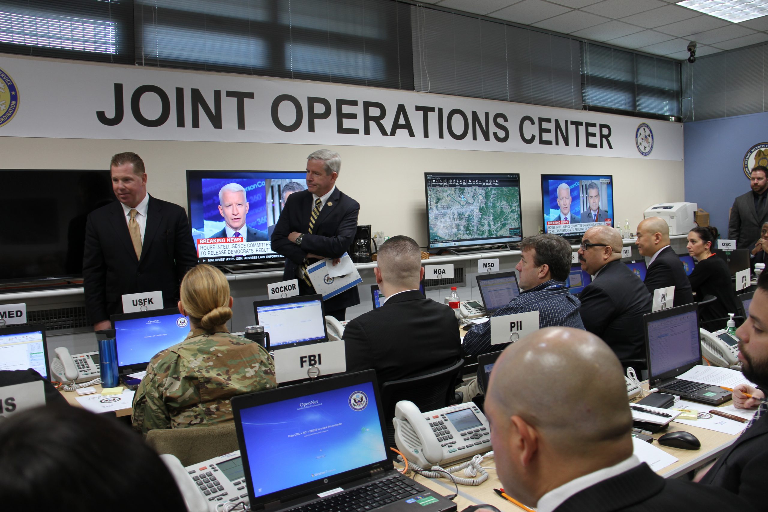 A U.S. Department of State Foreign Service Institute instructor (left, standing) leads a “table top” crisis management exercise at the DSS-managed Joint Operations Center (JOC), located at the U.S. Embassy in Seoul, South Korea, ahead of the 2018 Winter Olympics. DSS is the lead U.S. agency for security and liaison efforts for international sporting events, such as the Olympics, and collaborates with dozens of partners who also support these activities, Seoul, South Korea, Feb. 6, 2018. (U.S. Department of State photo)
